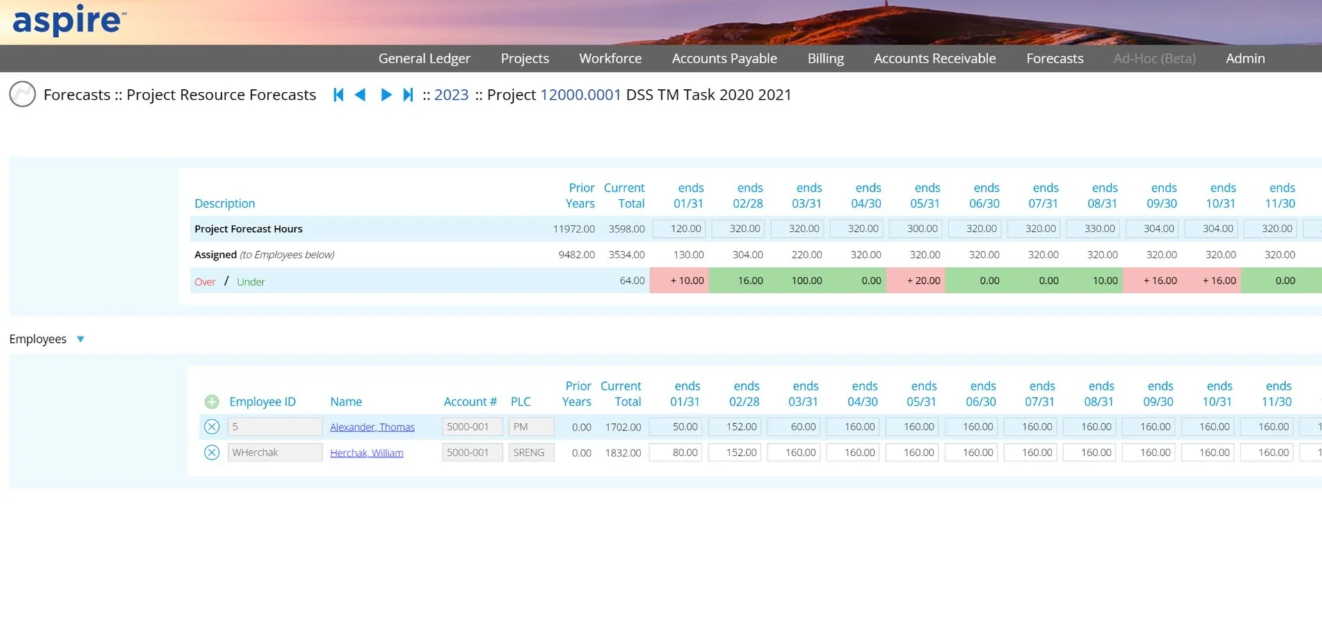 With Aspire’s workforce forecast view team leaders gain comprehensive top-line insights for all designated employees by fiscal year and period. Drill down to see individual resource availability to assist with alignment and utilization.